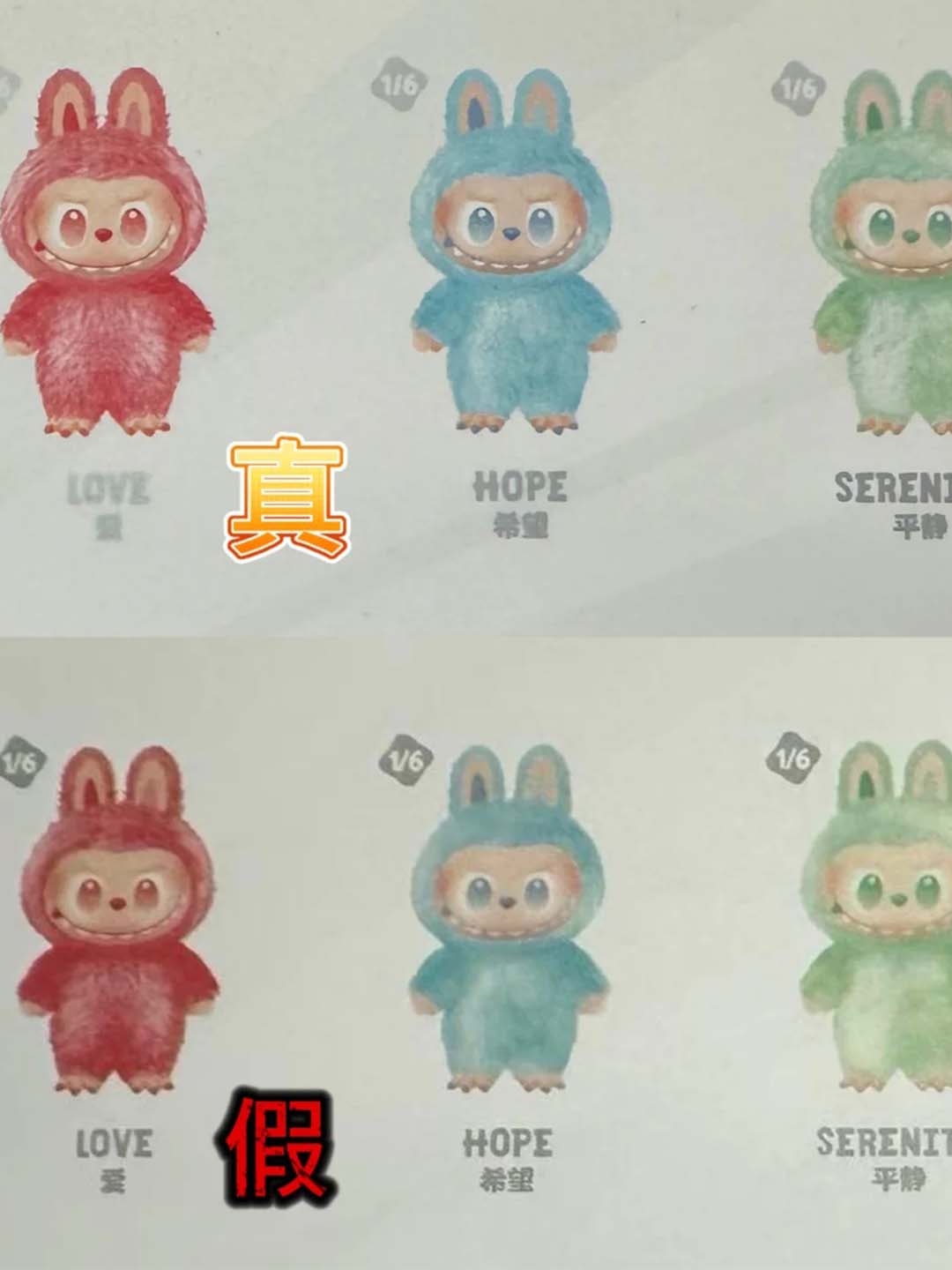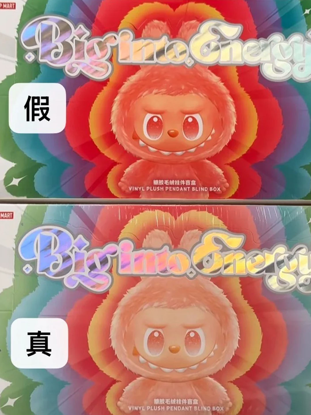1.正版小盒封面的labubu圖案清晰、顔色比較淺;側邊圖鑒顔色正常鮮艷;字體也比較粗壯清晰、鐳射特徵和大盒基本一致(斜向火焰形)。