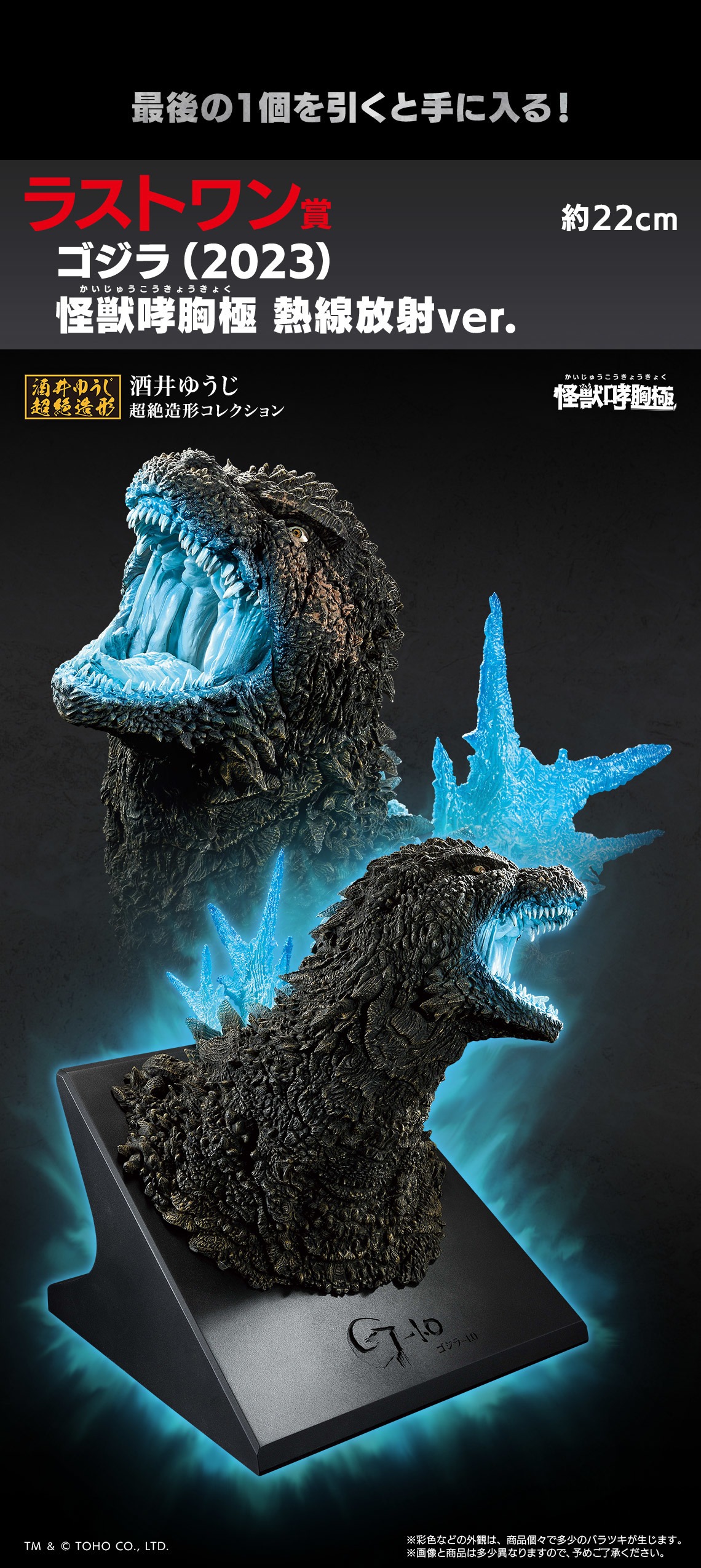 A 賞為由人氣怪獸原型師酒井裕司老師打造的全新胸像系列「怪獸咆哮胸極」的哥吉拉(2023),細膩雕刻重現負一哥頭部的造型細節,最後一賞則是哥吉拉(2023)怪獸咆哮胸極的放射熱線 Ver.,以精緻的塗裝在 A 賞的基礎上再現負一哥在電影中準備釋放放射熱線的魄力姿態!