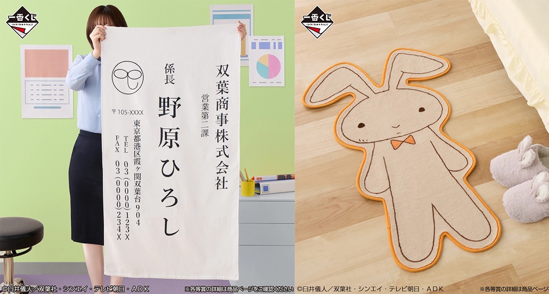 B賞是妮妮那隻「最倒楣」的兔子玩偶造型地墊,高達 90cm 的尺寸非常霸氣;C 賞「野原廣志巨大名片毛巾」,直接將野原家支柱——廣志那張印有「双葉商事 營業二課 係長」的名片,以 1:1 之外的「超巨大規格」放大呈現!而 D 賞 的溫感變色馬克杯,只要倒入熱飲就能看到小新與動感超人同步施放「動感光波」,視覺效果超驚喜。