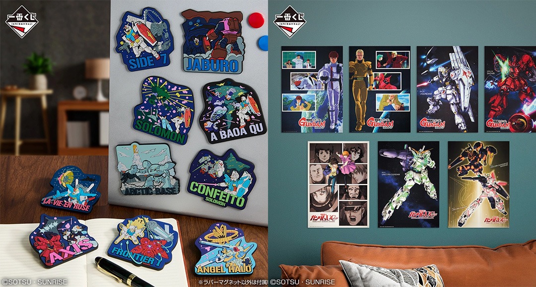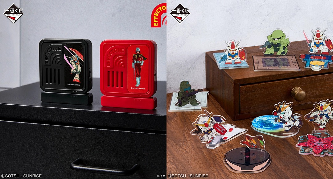 這套一番賞還收錄「颯爽的夏亞」等經典音效的「EFFECTONE」裝置、刻劃 Side 7 與所羅門等戰略要地的橡膠磁鐵,以及 13 款震撼力十足的 A3 透明海報。