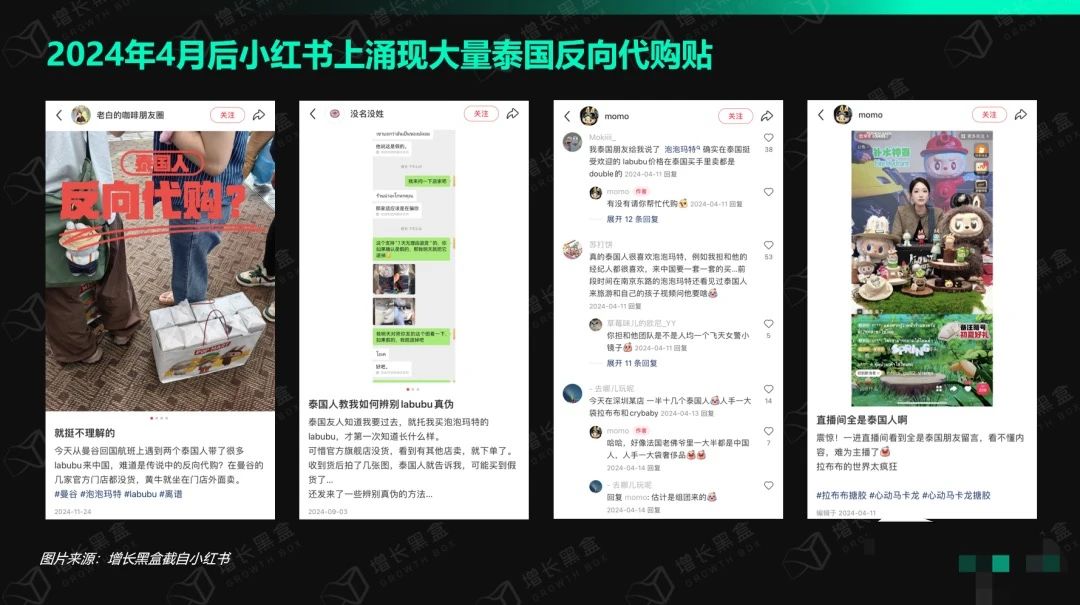 此時,社媒平臺上出現了大量“泰國友人托我買Labubu”“泰國人攻佔泡泡瑪特直播間”的熱帖,此後更是衍生出一批反向代購Labubu的攻略貼,向中國網友投放了第一批“鉤子”。