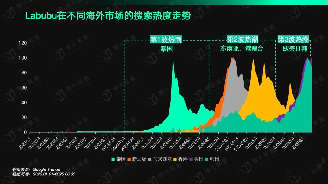 泰國市場的火爆,帶動了馬來西亞、新加坡等相鄰的東南亞市場。2024年9-12月,Labubu在東南亞的熱度居高不下,兩個月後,鄰近的港澳臺也掀起了熱潮。