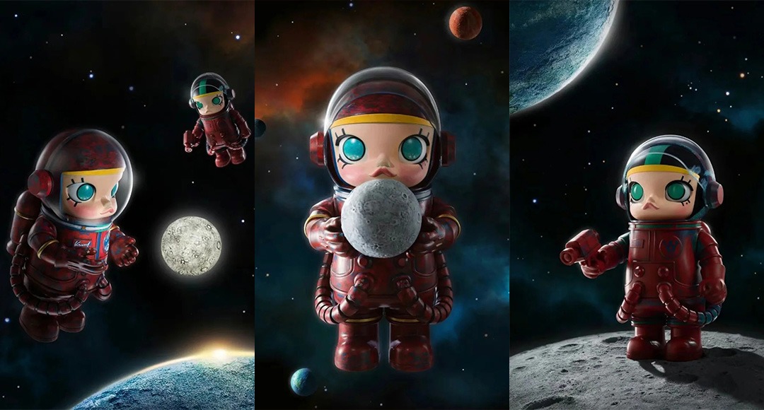 「MEGA SPACE MOLLY 《俯瞰》 你好,月亮」以浩瀚宇宙和飛向月球為主題,太空服的設計非常有科技感,通體硃砂紅的色調,賦予了它獨特的視覺衝擊力,彷彿是宇宙中一顆熾熱跳動的心臟。MOLLY手中緊緊握著月球,彷彿在與這顆神秘的星球進行一場跨越時空的對話;左手攜帶暗紅色透明裝置,還有暗紅色透明管線連接裝置,1000%尺寸的molly手捧月亮裝置,內置燈光可亮;400%尺寸則手持太空攝影機,兩種尺寸無論擺設、展示、拍照都絕對是視覺焦點!