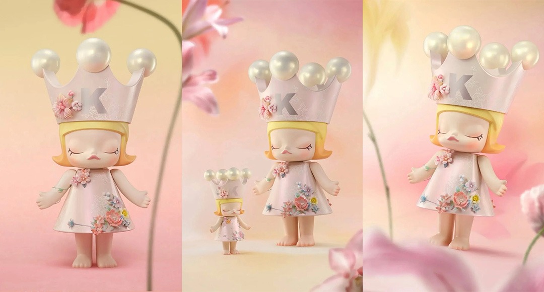 「MEGA ROYAL MOLLY 1000% / 400% 漫鎂花落・絨」以非遺絨花為主題,整體顏色以珠光粉白色為主,看起來十分高貴溫柔。Molly頭戴「珍珠光澤」的皇冠,點綴著粉色絨花,皇冠上大大的「K」標記,象徵 ROYAL 系列尊爵血統。正面裙擺則採用了絲綢般的光澤材質,搭配了經典立體的絨花裝飾,再加上精緻小巧的珍珠與浮雕花紋,細節的處理讓絨花和Molly的結合更加自然,彷彿絨花是從Molly身上自然生長出來一樣。每一朵花皆以手感材質精緻呈現,花瓣間透出濃濃春意,Molly閉目垂睫,像是在等一場江南煙雨,營造了一種夢幻淡雅的氛圍。