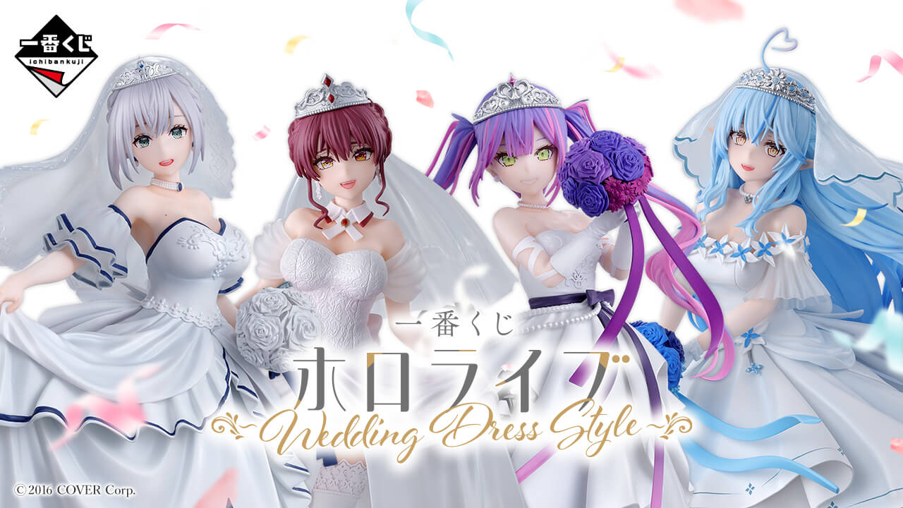 以hololive虚拟偶像的婚纱造型为主题,四位偶像身着精致婚纱,手持花束,细节处尽显优雅浪漫,洋溢梦幻唯美的氛围。